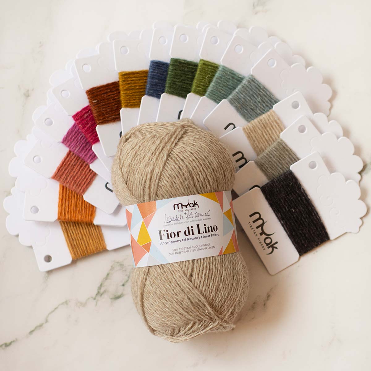 Kraemer says, "When Paola first told me about this latest yarn, I was really excited. A blend of Tibetan Cloud, Baby Yak and a bit of linen on top sounded perfect. And my expectations were more than fulfilled! Fior di Lino is a joy to knit with and produces a wonderfully soft yet beautifully supple fabric. The stitch definition and the drape are absolutely amazing. Perfect for sweaters and accessories. Knowing how important fair and safe working conditions are to mYak, along with their great love and respect for the environment, makes Fior di Lino a yarn I can recommend with all my knitter’s heart…. and I feel really honoured that mYak invited me to contribute to the colour palette of this beautiful yarn!”