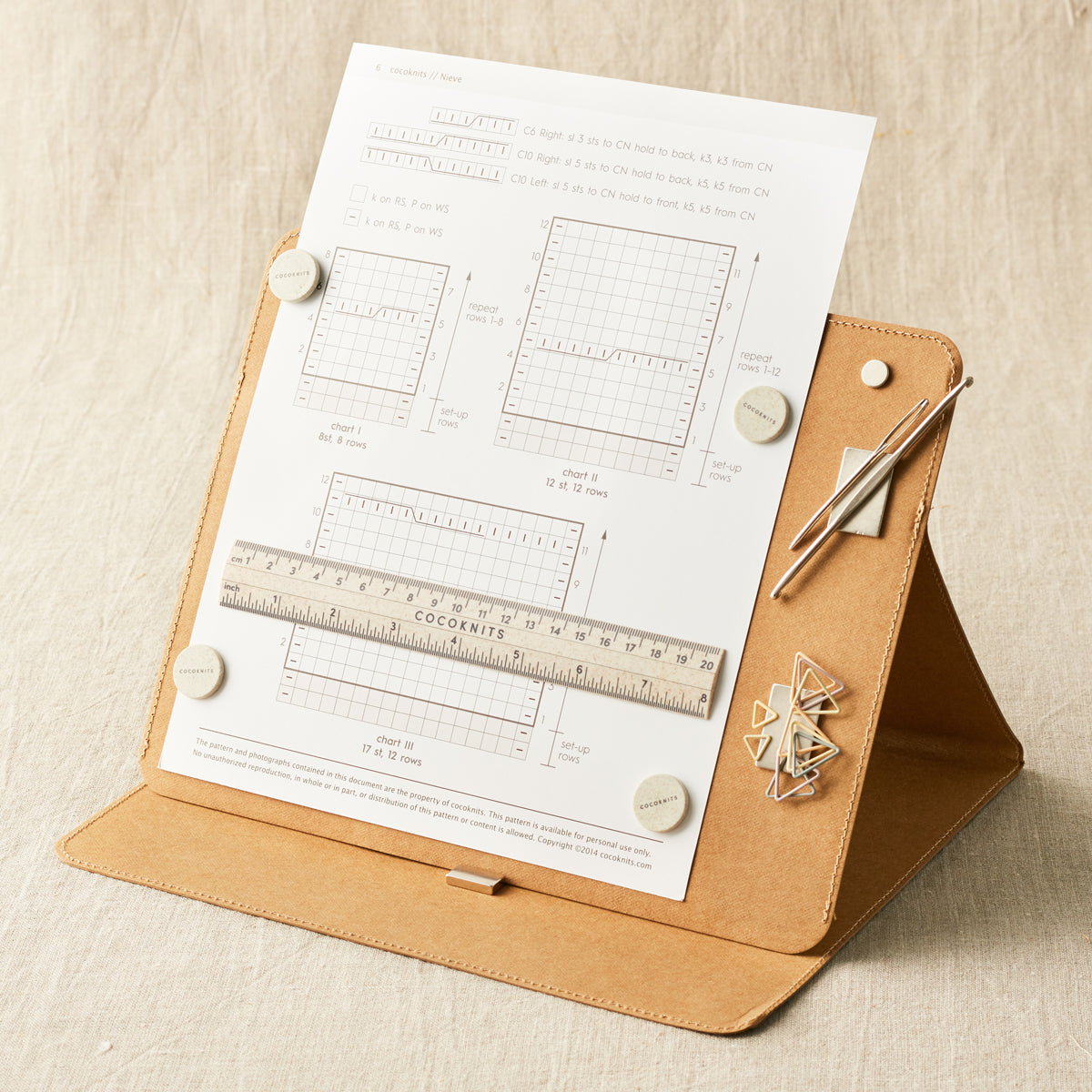 Made with washable kraft fabric, The Cocoknits Maker's Board features internal metal sheets that make every surface magnetic. Stick a chart on one surface and your pattern on another, and when you prop one side up for display, the angle is completely adjustable, making it even more versatile. Use the strong magnets included to keep charts, patterns, recipes, and more at hand while you’re working. Cling your other Cocoknits tools to the magnets on your Maker's Board, like a Row Counter, Stitch Markers, or a Tapestry Needle. As with many of Cocoknits' tools, the Maker's Board can help organize a variety of different projects – its uses are only limited by your imagination!