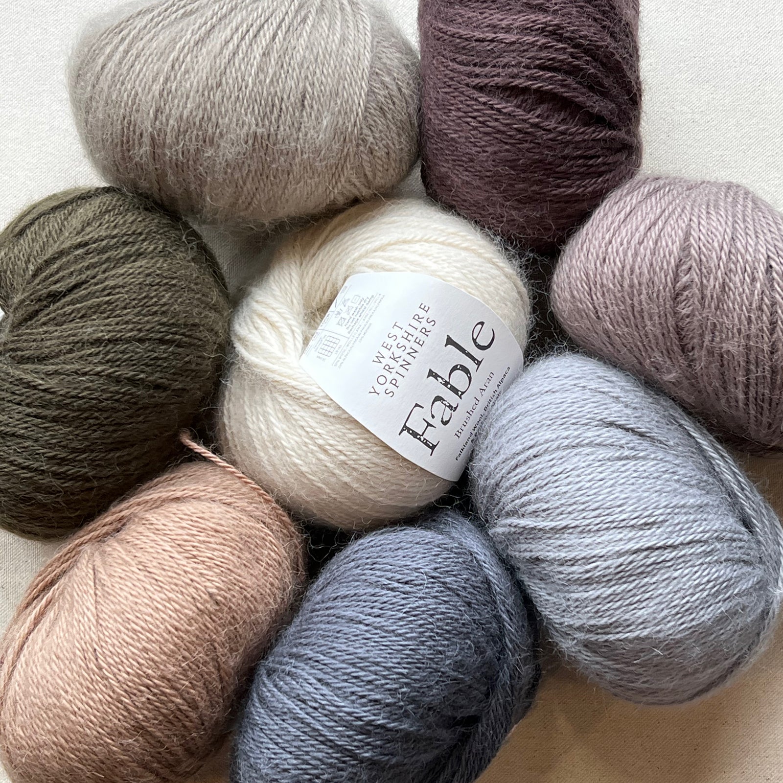 The blend of Falkland Wool, British Alpaca, and British Mohair gives Fable its exceptional warmth and drape. Falkland Wool provides resilience and structure, while British Alpaca adds silk-like softness, and British Mohair contributes a soft, ethereal halo. This unique fiber blend results in a yarn that is not only plush and cozy but also durable, making it perfect for creating both everyday accessories and cherished, long-lasting garments.