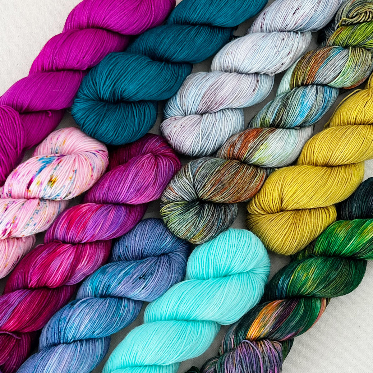 Owner and primary dyer, Jean, doesn't hold back on playing around with colors. Her unique colorways range from tonal neons, earthy variegated, and thrilling speckles! And in a nod to the rockers of the 80s and 90s, they are named after her favorite songs. It's a Gen X trip down Memory Lane!