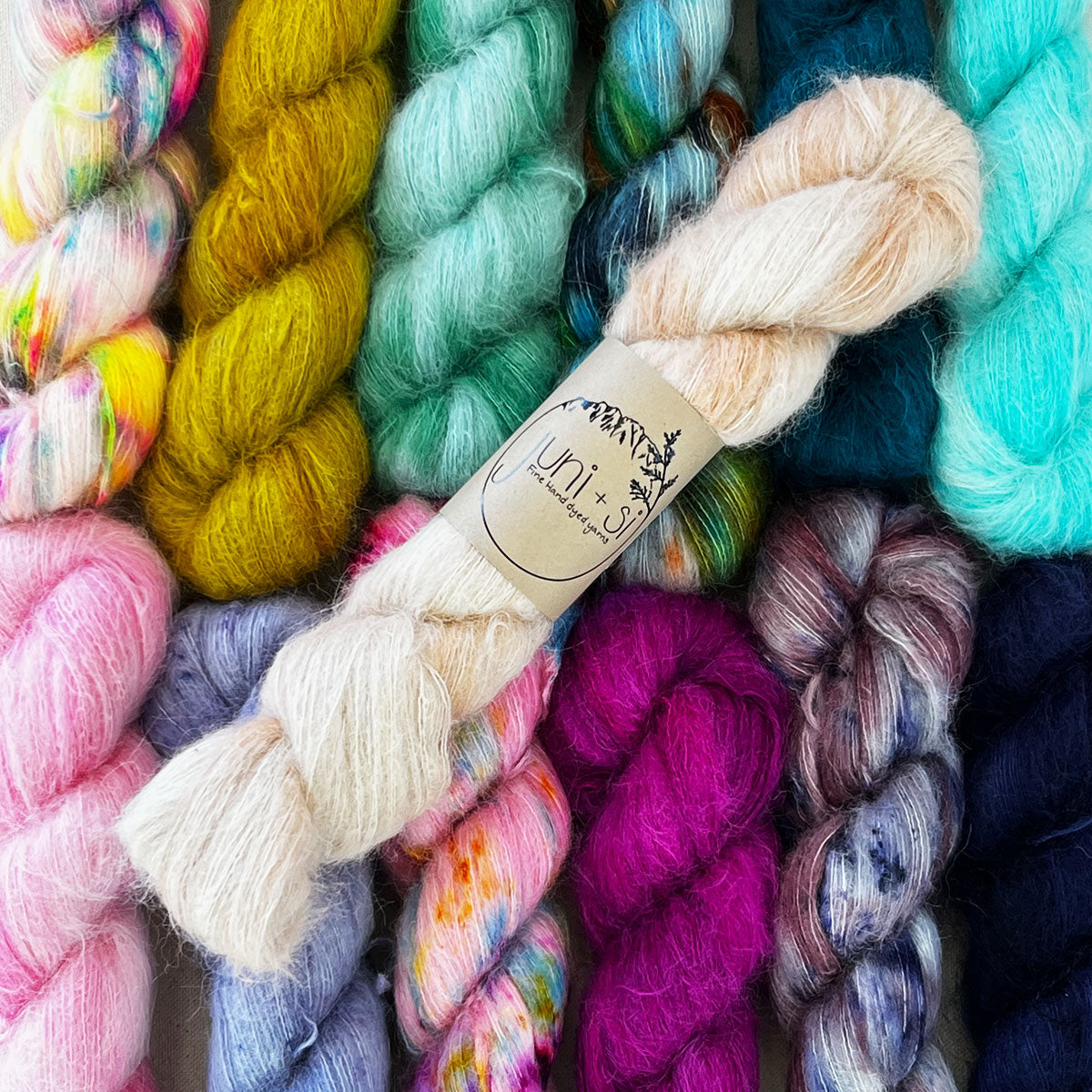 Owner and primary dyer, Jean, doesn't hold back when playing around with colors. Juni + Si'ds unique colorways range from tonal neons, earthy variegateds, and thrilling speckles! And in a nod to the rockers of the 80s and 90s, they are named after her favorite songs. It's a Gen X trip down Memory Lane!